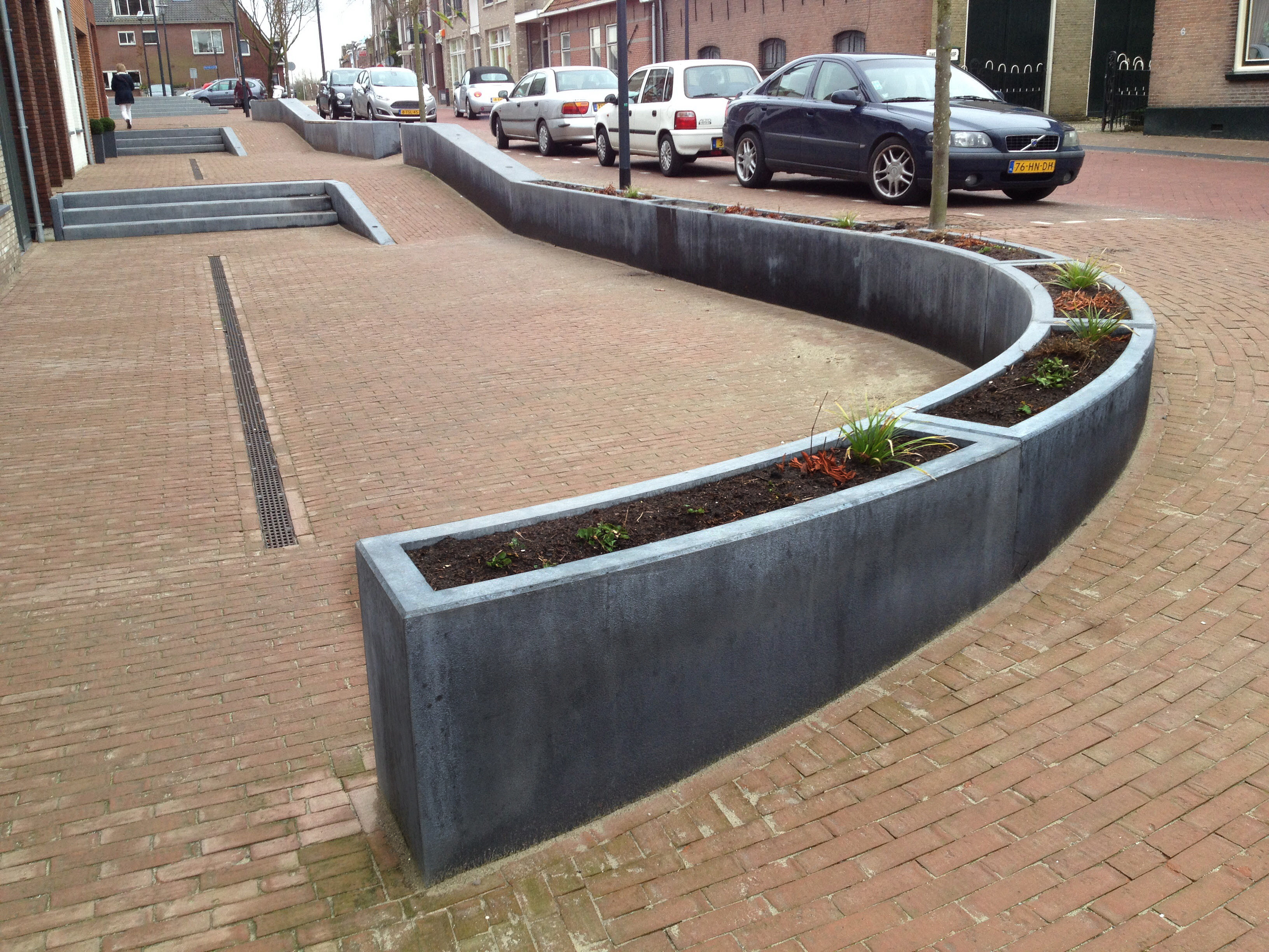 Hierdoor moest er een oplossing worden gevonden voor de hoogteverschillen ter plaatse van de nieuwbouw. Naar een ontwerp van Buro Imoss werd het geheel tot uitvoering gebracht. De antracietkleurige betonnen Giro Parkbanden 50x100 cm (bxh) en traptreden